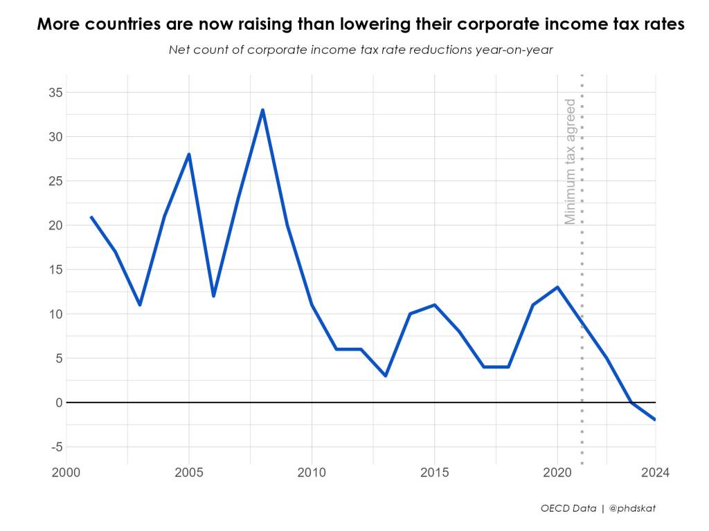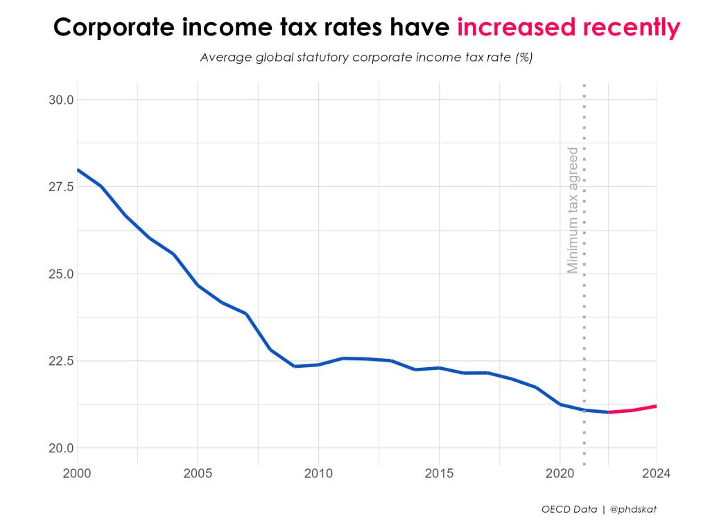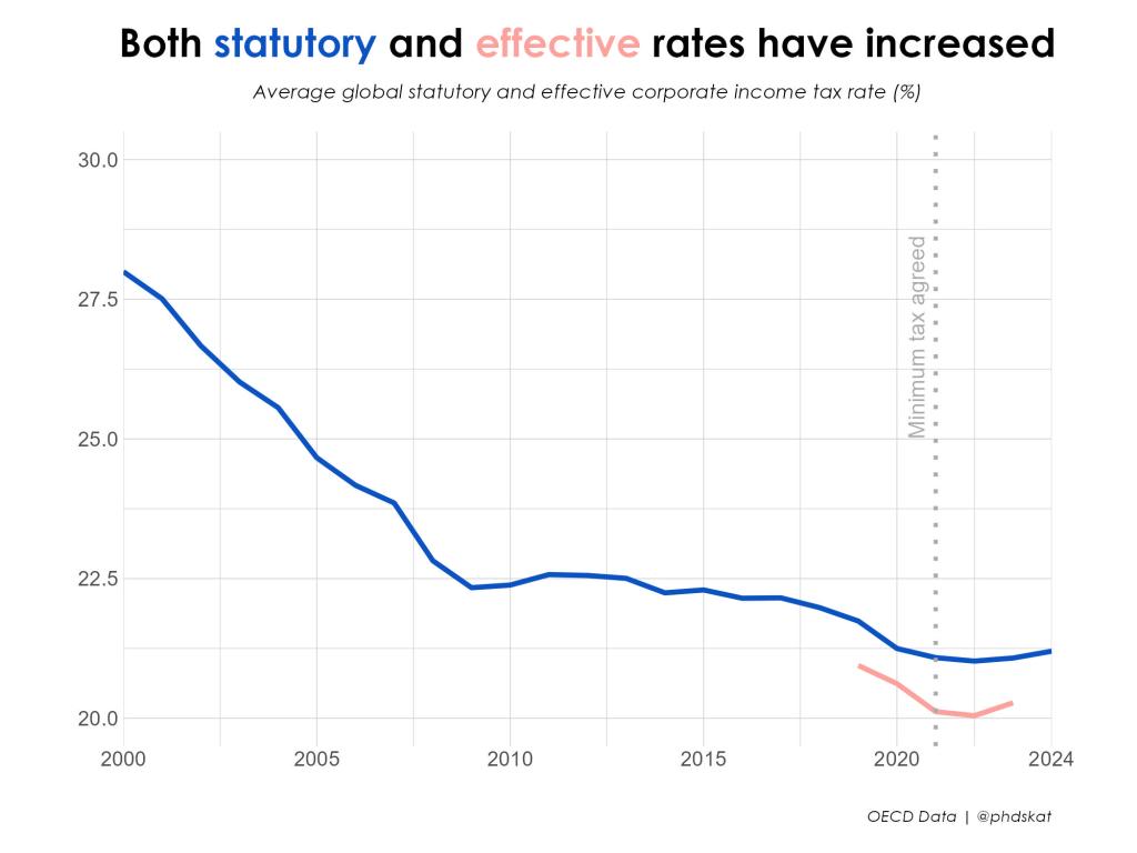 First, there is this: After half a century in free fall, the average global statutory corporate income tax rate has increased since 2022. It has increased only slightly, inching upwards, but that represents a stark break with a long historical trend.